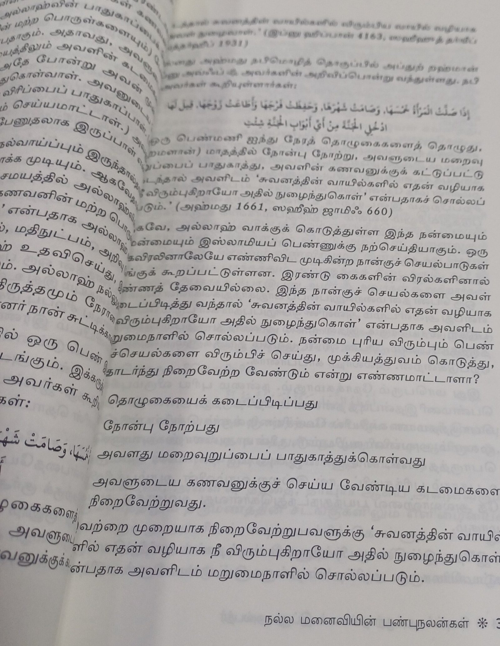 நல்ல மனைவியால் நல்ல குடும்பம் உருவாகின்றது. கெட்ட கணவனைக்கூடச் சீர்திருத்தும் ஆற்றல் அவளிடம் உண்டு. ஆனால், இதற்கு நல்ல வழிகாட்டல் தேவை. அல்லாஹ்வும் அவனுடைய தூதரும் சொல்லியபடி இஸ்லாமியக் கல்வியுடனும் இறையச்சத்துடனும் அவள் வாழத் தொடங்க வேண்டும். ஒரு பெண் நல்லவளாக, பத்தினித்தனமுள்ளவளாக, நேர்மையானவளாக, அல்லாஹ்வை வணங்குபவளாக ஆக வேண்டுமெனில் தீமையின் அனைத்து வாயில்களையும் விட்டு ஒதுங்கி, குழப்பமான அனைத்து சிந்தனைகளைவிட்டும் அவள் தன்னை காத்துக்கொள்ள வேண்டும். அல்லாஹ் பொறுப்புக் கொடுத்துள்ளதின்படி பெண் என்பவள் பெரும் பொறுப்புதாரியாவாள். அது உயர்வான முறையில் கவனம் எடுத்துக்கொள்ளத்தக்க மிக முக்கியத்துவம் வாய்ந்த பொறுப்பாகும்.